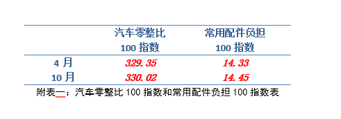 两协会按照汽车零整比100指数的编制规则,通过公开市场采集更新了各车型的配件价格(价格数据截至到9月),导入计算公式核算各车型的零整比系数,编制完成本期汽车零整比100指数[1],并同步更新测算了消费者常用配件负担100指数[2]。本期汽车零整比100指数为330 性巴克下载,02%;消费者常用配件负担100指数为14,45,两项指数同比2016年4月均呈小幅上涨态势。。